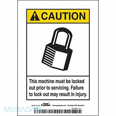 Safety Sign Vertical Rectangle Number of Printed Sides 1 English Sign Format ANSI/OSHA Format Sign Legend This Machine Must Be Locked Out Prior To Servicing. Failure To Lock Out May Result In Injury. Sign Legend Background Color White Sign Legend Style Symbol and Text