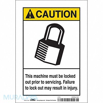 Safety Sign Horizontal Rectangle Number of Printed Sides 1 English Sign Format ANSI/OSHA Format Sign Legend This Machine Must Be Locked Out Prior To Servicing. Failure To Lock Out May Result In Injury. Sign Legend Background Color White Sign Legend Style Symbol and Text