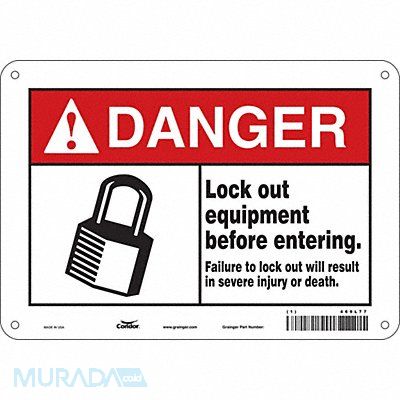 Safety Sign Vertical Rectangle Number of Printed Sides 1 English Sign Format ANSI/OSHA Format Sign Legend Lock Out Equipment Before Entering. Failure To Lock Out Will Result In Severe Injury Or Death. Sign Legend Background Color White Sign Legend Style Symbol and Text