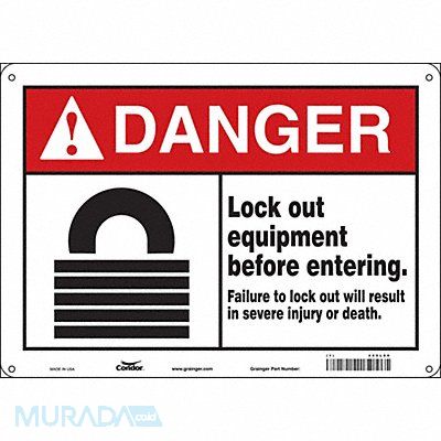Safety Sign Horizontal Rectangle Number of Printed Sides 1 English Sign Format ANSI/OSHA Format Sign Legend Lock Out Equipment Before Entering. Failure To Lock Out Will Result In Severe Injury Or Death. Sign Legend Background Color White Sign Legend Style Symbol and Text
