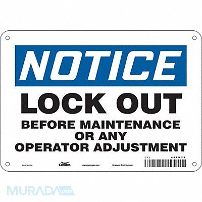 Safety Sign Vertical Rectangle Number of Printed Sides 1 English Sign Format Traditional OSHA Sign Legend Lock Out Before Maintenance Or Any Operator Adjustment Sign Legend Background Color White Sign Legend Style Text