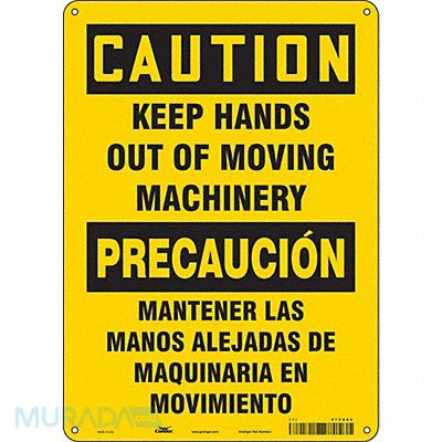 Safety Sign Vertical Rectangle Number of Printed Sides 1 English Spanish Sign Format Traditional OSHA Sign Legend Keep Hands Out Of Moving Machinery/Mantener Las Manos Alejadas De Maquinaria En Movimento Sign Legend Background Color Yellow Sign Legend Style Text