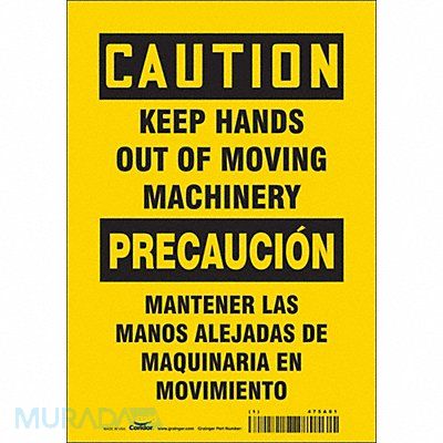 Safety Sign Horizontal Rectangle Number of Printed Sides 1 English Spanish Sign Format Traditional OSHA Sign Legend Keep Hands Out Of Moving Machinery/Mantener Las Manos Alejadas De Maquinaria En Movimento Sign Legend Background Color Yellow Sign Legend Style Text