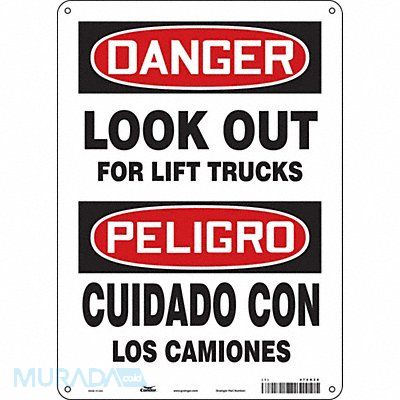Safety Sign Vertical Rectangle Number of Printed Sides 1 English Spanish Sign Format Traditional OSHA Sign Legend Look Out For Lift Trucks/Cuidado Con Los Camiones Sign Legend Background Color White Sign Legend Style Text