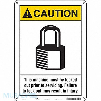 Safety Sign Vertical Rectangle Number of Printed Sides 1 English Sign Format ANSI/OSHA Format Sign Legend This Machine Must Be Locked Out Prior To Servicing. Failure To Lock Out May Result In Injury. Sign Legend Background Color White Sign Legend Style Symbol and Text