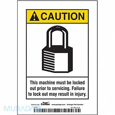 Safety Sign Vertical Rectangle Number of Printed Sides 1 English Sign Format ANSI/OSHA Format Sign Legend This Machine Must Be Locked Out Prior To Servicing. Failure To Lock Out May Result In Injury. Sign Legend Background Color White Sign Legend Style Symbol and Text