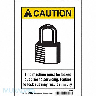 Safety Sign Horizontal Rectangle Number of Printed Sides 1 English Sign Format ANSI/OSHA Format Sign Legend This Machine Must Be Locked Out Prior To Servicing. Failure To Lock Out May Result In Injury. Sign Legend Background Color White Sign Legend Style Symbol and Text