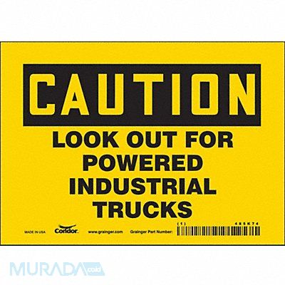 Safety Sign Horizontal Rectangle Number of Printed Sides 1 English Sign Format Traditional OSHA Sign Legend Look Out For Powered Industrial Trucks Sign Legend Background Color Yellow Sign Legend Style Text