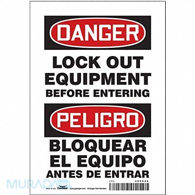 Lockout Sign Horizontal Rectangle Number of Printed Sides 1 English Spanish Sign Format Traditional OSHA Sign Legend Lock Out Equipment Before Entering/Bloquear El Equipo Antes De Entrar Sign Legend Background Color White Sign Legend Style Text