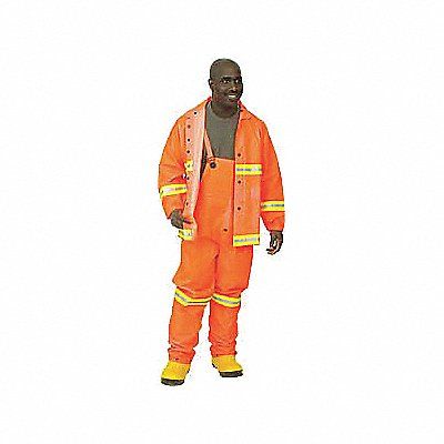 Rainsuit with Detachable Hood Color Orange Material PVC Hood Style Detachable ANSI Class 1 High-Visibility Yes Size M Jacket Length 30 in Fly Closure Type Snaps Style 3 Piece Rain Suit with Jacket/Bib Overall Includes Lining Yes Lining Material Polyester Thickness 0.35 mil Features Lime/Silver Reflectve Stripes Includes Hood Yes Number of Coat Pockets 2 ANSI Type O Jacket Entry Closure Type Snaps Inseam 27 1/2 in Maximum Chest Size 52 in Maximum Waist Size 46 in