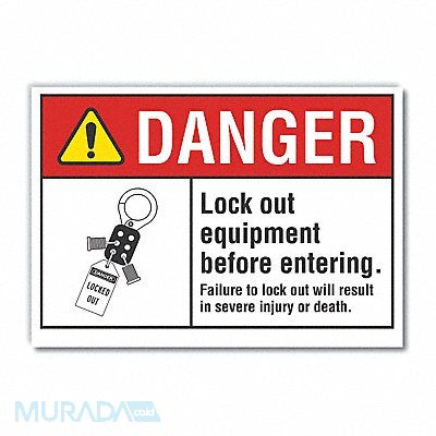 Danger Sign Horizontal Rectangle Number of Printed Sides 1 English Sign Format ANSI/OSHA Format Sign Legend Lock Out Equipment Before Entering. Failure To Lock Out Will Result In Severe Injury Or Death. Sign Legend Background Color White Sign Legend Style Symbol and Text