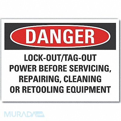 Danger Sign Horizontal Rectangle Number of Printed Sides 1 English Sign Format Traditional OSHA Sign Legend Lock-Out/Tag-Out Power Before Servicing Repairing Cleaning Or Retooling Equipment Sign Legend Background Color White Sign Legend Style Text