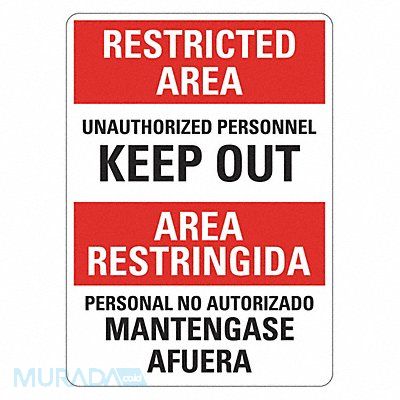 Restricted Area Sign Vertical Rectangle Number of Printed Sides 1 English Spanish Sign Format Other Format Sign Legend Unauthorized Persons Keep Out/Personal No Autorizado Mantengase Afuera Sign Legend Background Color White Sign Legend Style Symbol and Text