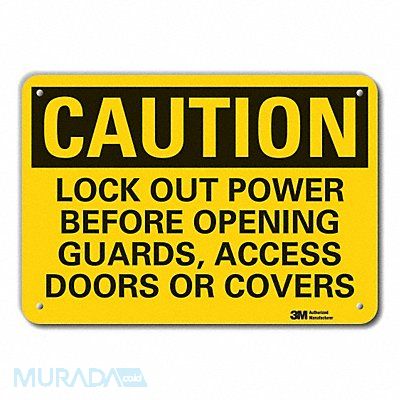 Reflective Lockout Tagout Caution Sign Horizontal Rectangle Number of Printed Sides 1 English Sign Format Traditional OSHA Sign Legend Lock Out Power Before Opening Guards Access Doors Or Covers Sign Legend Background Color Yellow Sign Legend Style Text