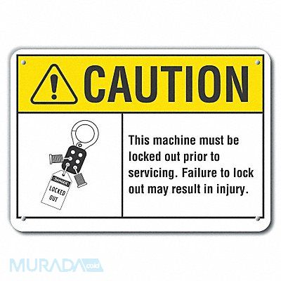 Reflective Lockout Tagout Caution Sign Vertical Rectangle Number of Printed Sides 1 English Sign Format ANSI/OSHA Format Sign Legend This Machine Must Be Locked Out Prior To Servicing. Failure To Lock Out May Result In Injury. Sign Legend Background Color White Sign Legend Style Symbol and Text