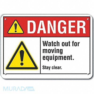 Danger Sign Horizontal Rectangle Number of Printed Sides 1 English Sign Format ANSI/OSHA Format Sign Legend Watch Out For Moving Equipment. Stay Clear. Sign Legend Background Color White Sign Legend Style Symbol and Text