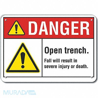 Danger Sign Horizontal Rectangle Number of Printed Sides 1 English Sign Format ANSI/OSHA Format Sign Legend Open Trench. Fall Will Result In Severe Injury Or Death. Sign Legend Background Color White Sign Legend Style Symbol and Text