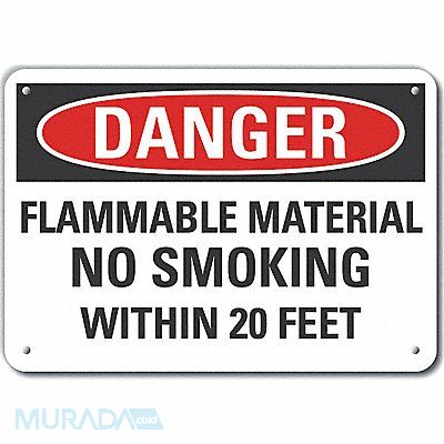 Plastic Flammable Material Danger Sign Horizontal Rectangle Number of Printed Sides 1 English Sign Format Traditional OSHA Sign Legend Flammable Material No Smoking Within 20 Feet Sign Legend Background Color White Sign Legend Style Text