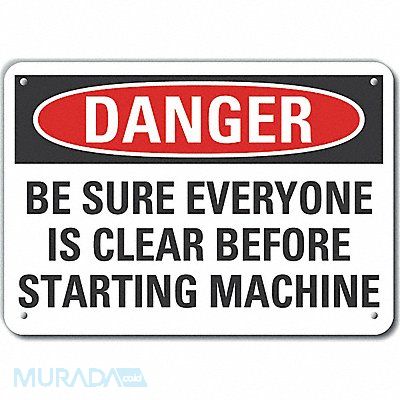 Plastic Stay Clear Danger Sign Horizontal Rectangle Number of Printed Sides 1 English Sign Format Traditional OSHA Sign Legend Be Sure Everyone Is Clear Before Starting Machine Sign Legend Background Color White Sign Legend Style Text