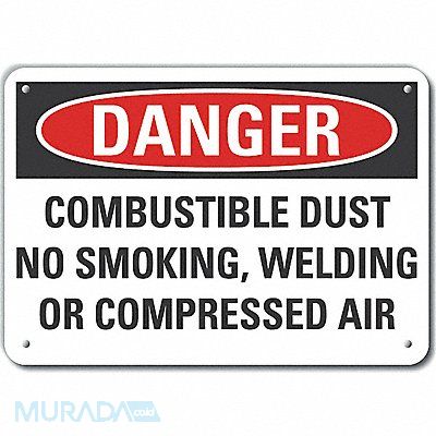 Plastic Combustible Dust Danger Sign Vertical Rectangle Number of Printed Sides 1 English Sign Format Traditional OSHA Sign Legend Combustible Dust No Smoking Welding Or Compressed Air Sign Legend Background Color White Sign Legend Style Text