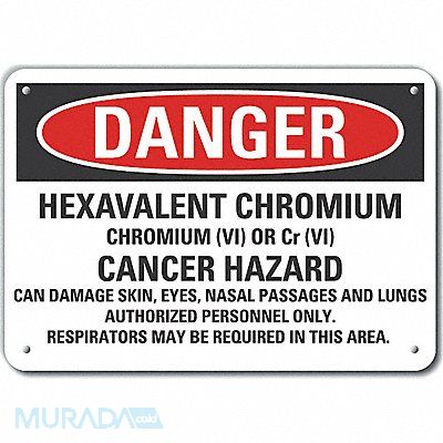 Danger Sign Horizontal Rectangle Number of Printed Sides 1 English Sign Format Traditional OSHA Sign Legend Hexavalent Chromium Chromium (Vi) Or Cr (Vi) Cancer Hazard Can Damage Skin Eyes Nasal Passages And Lungs. Authorized Personnel Only. Respirators May Be Required In This Area. Sign Legend Background Color White Sign Legend Style Text