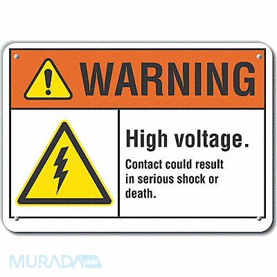 Plastic High Voltage Warning Sign Horizontal Rectangle Number of Printed Sides 1 English Sign Format ANSI/OSHA Format Sign Legend High Voltage. Contact Could Result In Serious Shock Or Death. Sign Legend Background Color White Sign Legend Style Symbol and Text