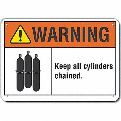 Plastic Cylinder Handling Warning Sign Horizontal Rectangle Number of Printed Sides 1 English Sign Format ANSI/OSHA Format Sign Legend Keep All Cylinders Chained. Sign Legend Background Color White Sign Legend Style Symbol and Text