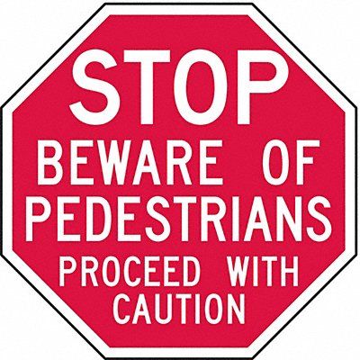 Reflective Pedestrian Sign Octagon Number of Printed Sides 1 English Sign Format Other Format Sign Legend Stop Beware of Pedestrians Proceed with Caution Sign Legend Background Color Red Sign Legend Style Text