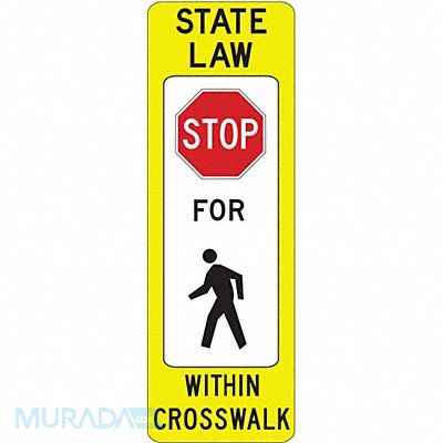 State Law Stop For Pedestrian Within Crosswalk Traffic Sign Height 36 in Width 12 in Sign Material Aluminum Sign Mounting Style Mounting Holes Printed Language English Sign Shape Vertical Rectangle