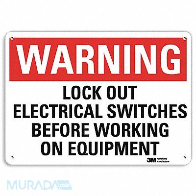 Warning Sign Horizontal Rectangle Number of Printed Sides 1 English Sign Format Traditional OSHA Sign Legend Lock Out Electrical Switches Before Working On Equipment Sign Legend Background Color White Sign Legend Style Text