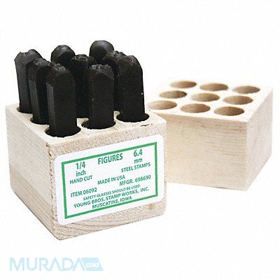Hand Cut Number Set Character Height 1/2 in Character Type Set Number Set Characters Included 0 to 8 (With 6 Serving as 9) Duty Moderate For Maximum Surface Hardness 50 on A Rockwell C Scale For Shank Diameter (9) 3/8 in Holder Length Not Applicable Holder Shank Size Not Applicable Impression Character Style Gothic Includes (9) 0 to 8 (With 6 Serving as 9) Product Type Hand Stamp Kit Shank Length 3 3/8 in Shank Thickness 5/8 in Shank Width 5/8 in Stamp Material Steel