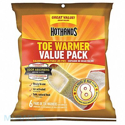 Toe Warmer Warmer Type Toe Warmer Activation Method Air-Activated Heating Time Up to 8 hr Average Temperature 97 Degrees F Time to Reach Average Temperature 15 min to 30 min Number of Warmers Included 6 Length 3 1/2 in Width 2 3/4 in Reusability Disposable For Use With Footwear Package Quantity 6
