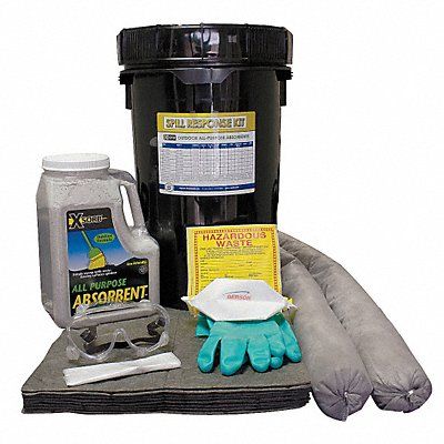 Spill Kit/Station Fluids Absorbed Universal Volume Absorbed Per Kit 5 gal Container Type Bucket 13 in W x 20 in L x 13 in H Container Size Black Sorbents Included (10) FiberLink Universal Pads (2) 4 ft FiberLink Universal Socks PPE Included Dust Mask Pair Goggles Pair Nitrile Gloves Additional Components Included (2) Disposal Bags (2) Hazmat Labels XSORB Outdoor All-Purpose 6 qt Bottle U.N. Certified 1H2/Y30/S