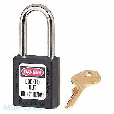 Lockout Padlock Body Color Black Body Height 1 3/4 in Body Material Thermoplastic Body Thickness 3/4 in Body Width 1 1/2 in Header Danger Horizontal Shackle Clearance 25/32 in Key Style Standard Key Type Keyed Alike Non-Removable Key Yes Resistance Properties Chemical Resistant Shackle Diameter 1/4 in Shackle Height 1 1/2 in Shackle Material Metal Shackle Type Open Vertical Shackle Clearance 1 1/2 in Width Across Shackle 25/32 in Features Reserved for Safety Cylinder