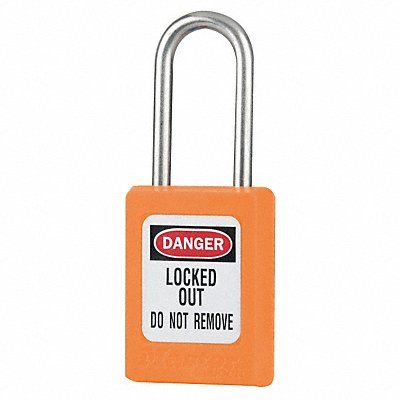 D5337 Lockout Padlock Body Color Orange Body Height 1 7/8 in Body Material Thermoplastic Body Thickness 11/16 in Body Width 1 3/8 in Header Danger Horizontal Shackle Clearance 5/8 in Key Style Standard Key Type Keyed Different Non-Removable Key Yes Resistance Properties Corrosion Resistant Shackle Diameter 3/16 in Shackle Height 1 1/2 in Shackle Material Stainless Steel Shackle Type Open Vertical Shackle Clearance 1 1/2 in Width Across Shackle 5/8 in Includes Labels