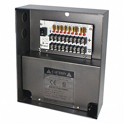 Camera Power Supply Output Voltage 12V DC Input Voltage 110V AC 50/60 Hz Characteristics More Than 1A per Channel Output Individual PTC Auto Reset Fuse for Each Output Individual LED Status Indicator for Each Output Main Power Switch with Surge Protection for 9 Channel Height 8 1/2 in Width 3 1/2 in Length 9 7/8 in For Use With 12V DC Video Surveillance Cameras Standards UL Listed