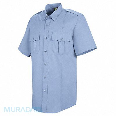 New Dimension Stretch Dress Shirt Short Sleeve Material 65 Percent Polyester/35 Percent Cotton Color Light Blue Neck Size 14-1/2 in Fits Chest Size 42 in Length 32 in Pockets 2 Fabric Weight 4.5 Oz.