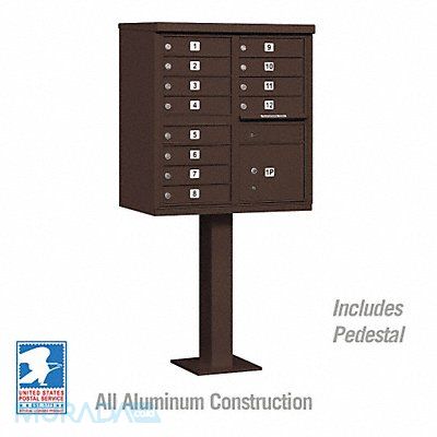 Cluster Box Unit 2 Type Number of Doors 13 Color Bronze Height 62-3/4 in Depth 30-1/2 in Width 18 in Box Material Aluminum Loading Front Mounting Pedestal Orientation Horizontal Slot Capacity 11-3/4 in W x 3/4 in H Door Material Aluminum Finish Powder Coated Post Height 28-1/2 in Post Material Aluminum Post Thickness 12 in Net Weight 145 lb Includes Pedestal