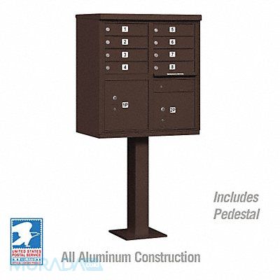 Cluster Box Unit 1 Type Number of Doors 10 Color Bronze Height 62-3/4 in Depth 30-1/2 in Width 18 in Box Material Aluminum Loading Front Mounting Pedestal Orientation Horizontal Slot Capacity 11-3/4 in W x 3/4 in H Door Material Aluminum Finish Powder Coated Post Height 28-1/2 in Post Material Aluminum Post Thickness 12 in Net Weight 145 lb Includes Pedestal