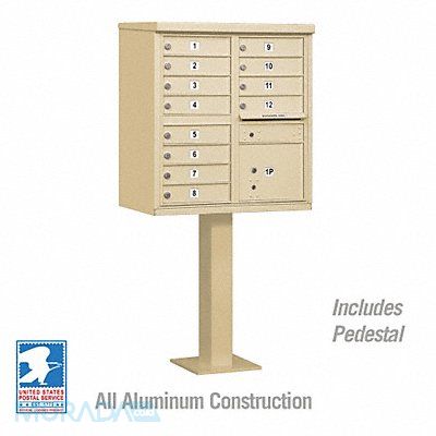 Cluster Box Unit 2 Type Number of Doors 13 Color Sandstone Height 62-3/4 in Depth 30-1/2 in Width 18 in Box Material Aluminum Loading Front Mounting Pedestal Orientation Horizontal Slot Capacity 11-3/4 in W x 3/4 in H Door Material Aluminum Finish Powder Coated Post Height 28-1/2 in Post Material Aluminum Post Thickness 12 in Net Weight 145 lb Includes Pedestal