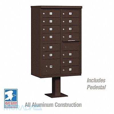 Cluster Box Unit 4 Type Number of Doors 14 Color Bronze Height 62-3/4 in Depth 30-1/2 in Width 18 in Box Material Aluminum Loading Front Mounting Pedestal Orientation Horizontal Slot Capacity 11-3/4 in W x 3/4 in H Door Material Aluminum Finish Powder Coated Post Height 14-1/2 in Post Material Aluminum Post Thickness 12 in Net Weight 165 lb Includes Pedestal