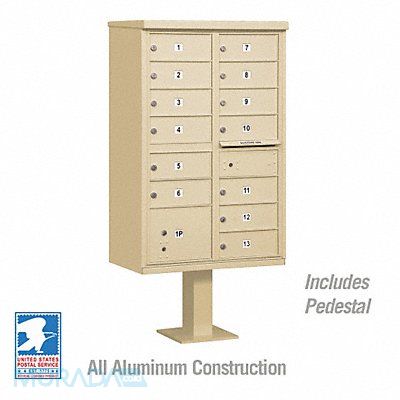 Cluster Box Unit 4 Type Number of Doors 14 Color Sandstone Height 62-3/4 in Depth 30-1/2 in Width 18 in Box Material Aluminum Loading Front Mounting Pedestal Orientation Horizontal Slot Capacity 11-3/4 in W x 3/4 in H Door Material Aluminum Finish Powder Coated Post Height 14-1/2 in Post Material Aluminum Post Thickness 12 in Net Weight 165 lb Includes Pedestal
