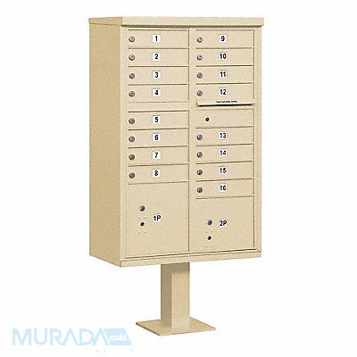 Cluster Box Unit 3 Type Number of Doors 18 Color Sandstone Height 62-3/4 in Depth 30-1/2 in Width 18 in Box Material Aluminum Loading Front Mounting Pedestal Orientation Horizontal Slot Capacity 11-3/4 in W x 3/4 in H Door Material Aluminum Finish Powder Coated Post Height 14-1/2 in Post Material Aluminum Post Thickness 12 in Net Weight 165 lb Includes Pedestal