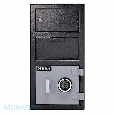 Cash Depository Safe Two Tone Black Gray Net Weight 104 lb Capacity 1.5 cu ft Not Rated Fire Rating Water Endurance Not Specified Material Steel Finish Matte Paint Max User Codes 1 Number of Shelves 0 Number of Doors 2 Number of Drawers 0 Lock Style Electronic Number of Bolts 3 Outside Height 27 1/4 in Outside Width 14 in Outside Depth 14 in Inside Height 9 in Inside Width 13 3/4 in Inside Depth 11 in Door Opening Height 5-1/4 in (Top) 9-1/2 in (Bottom)