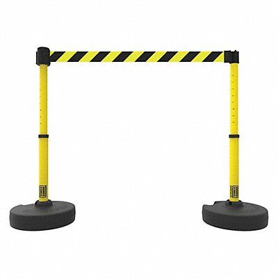 PLUS Barrier System Color Yellow with Black Stripes Belt Message None Belt Length 15 ft Belt Material Polyester Fabric Base Type Fillable with Water or Sand Base Dia 16 in Base Height 4 3/4 in Base Material Plastic Post Height 22 in to 42 in Adjustable Post Material Plastic Post Dia 2 3/8 in Includes (2) PLUS Bases (2) PLUS Stanchions PLUS Banner Head PLUS Receiver Head