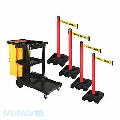 Barrier Systems Belt Color Yellow with Black Text Belt Message Danger - Keep Out Post Color Red Base Color Black Belt Length 10 ft Post Dia 2 1/2 in Post Height 40 in Post Material PVC Base Dia 15 in Base Type Square Base Material Rubber Cart Material Plastic Overall Height 44 1/2 in Overall Width 21 3/4 in Overall Depth 46 in Includes Barrier Cart Bungees and Yellow Bag Four Posts and Bases