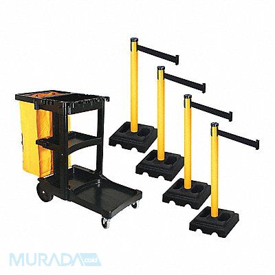 Barrier Systems Belt Color Black Post Color Yellow Base Color Black Belt Length 10 ft Post Dia 2 1/2 in Post Height 40 in Post Material PVC Base Dia 15 in Base Type Square Base Material Rubber Cart Material Plastic Overall Height 44 1/2 in Overall Width 21 3/4 in Overall Depth 46 in Includes Barrier Cart Bungees and Yellow Bag Four Posts and Bases