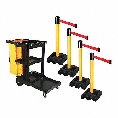 Barrier Systems Belt Color Red Post Color Yellow Base Color Black Belt Length 15 ft Post Dia 2 1/2 in Post Height 40 in Post Material PVC Base Dia 15 in Base Type Square Base Material Rubber Cart Material Plastic Overall Height 44 1/2 in Overall Width 21 3/4 in Overall Depth 46 in Includes Barrier Cart Bungees and Yellow Bag Four Posts and Bases