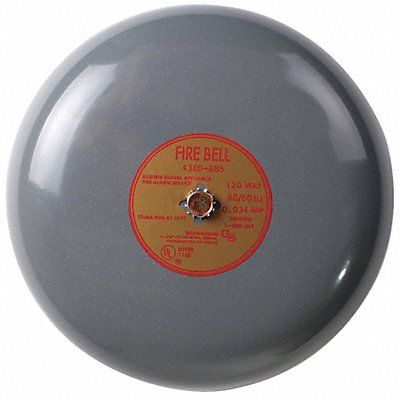 Fire Bell Vibrating Finish Gray Surface Mounting Alarm Current 34mA Peak Output (dBA) 86 Depth (In.) 3 3/8 in Height (In.) 8 in Length (In.) 8 in Ambient Temp Limits (F) -31 to 150 Degrees Voltage 120V AC Standards CSFM UL