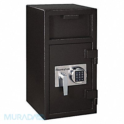 Cash Depository Safe Black Net Weight 121 lb Capacity 1.57 cu ft Not Rated Fire Rating Water Endurance Not Specified Material Solid Steel Finish Powder Coated Max User Codes 1 Number of Shelves 1 Number of Doors 1 Number of Drawers 0 Lock Style Programmable Electronic w/Time Delay Number of Bolts 3 Steel Live Locking Outside Height 27 in Outside Width 14 in Outside Depth 15 3/5 in Inside Height 14 1/2 in Inside Width 13 11/16 in Inside Depth 11 1/3 in